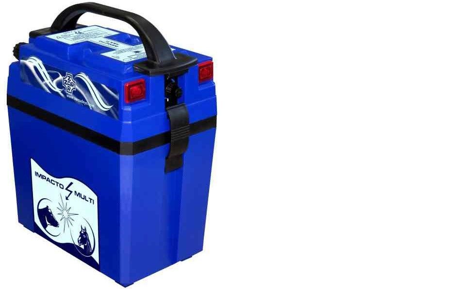 Pastor Mod. IMPACTO MULTI, con pila alcalina de 1300 w, capaz de abastecer una cerca de hasta 10 Km. en buenas condiciones de mantenimiento, que eviten pérdidas de potencia.