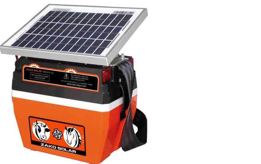 Pastor Mod. ZAKO SOLAR, alimentado con una batería de 12 V recargable, ayudada con un panel solar de 5 W, que se fija en la parte superior, incluye también un cargador, por si fuera necesario ante la falta de sol.